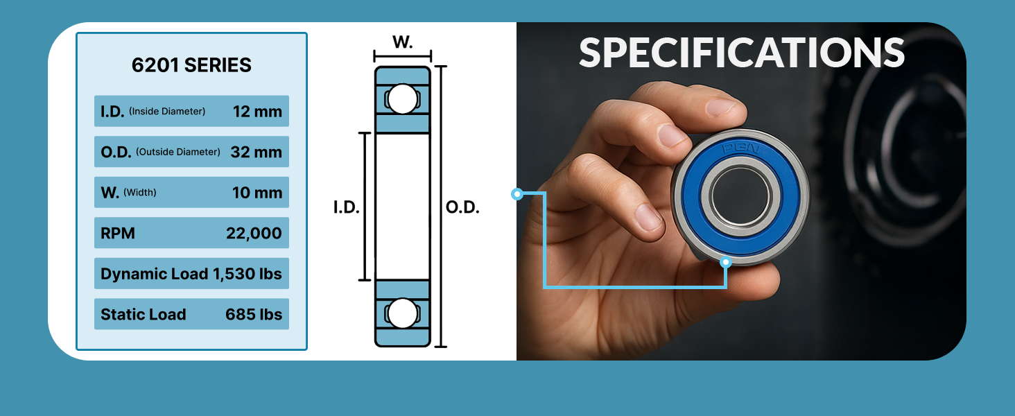 The PGN 6201-2RS Bearing is a high-quality, lubricated chrome steel sealed ball bearing measuring 12x32x10mm. Designed for high RPM support and extreme durability, it features dual rubber seals for enhanced protection and is proudly manufactured in the USA.