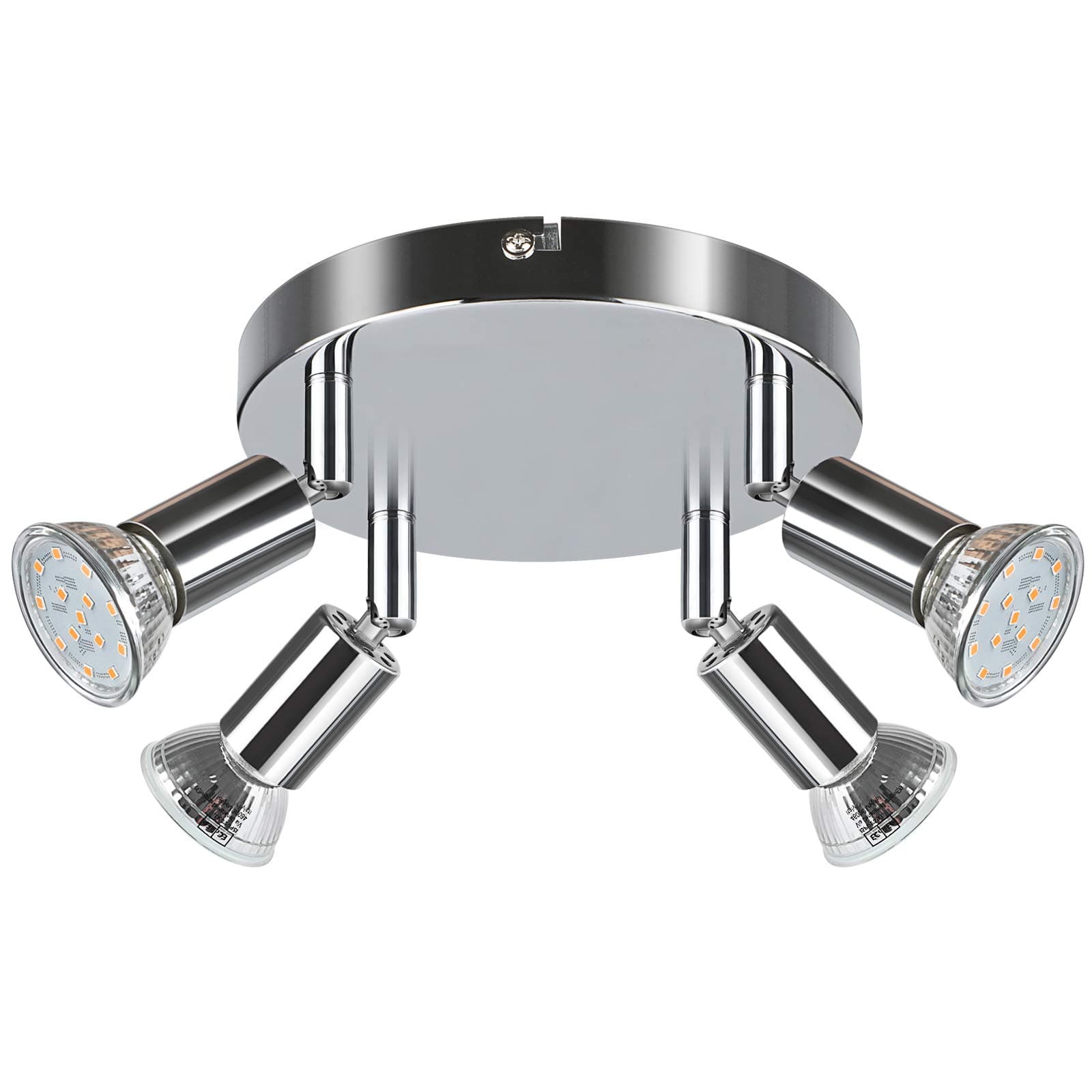 The Creyer LED Ceiling Light features four 4W GU10 LED bulbs emitting 400 lumens each in a warm 2900K glow. Its rotatable and swivel design offers customizable lighting angles, perfect for kitchens, living rooms, and offices. With a sleek white chrome finish, energy-efficient operation saving over 90% electricity, and a 20,000-hour bulb lifespan, this modern fixture combines style, sustainability, and versatility. Installation is straightforward, and the product includes an 18-month warranty for added confidence.