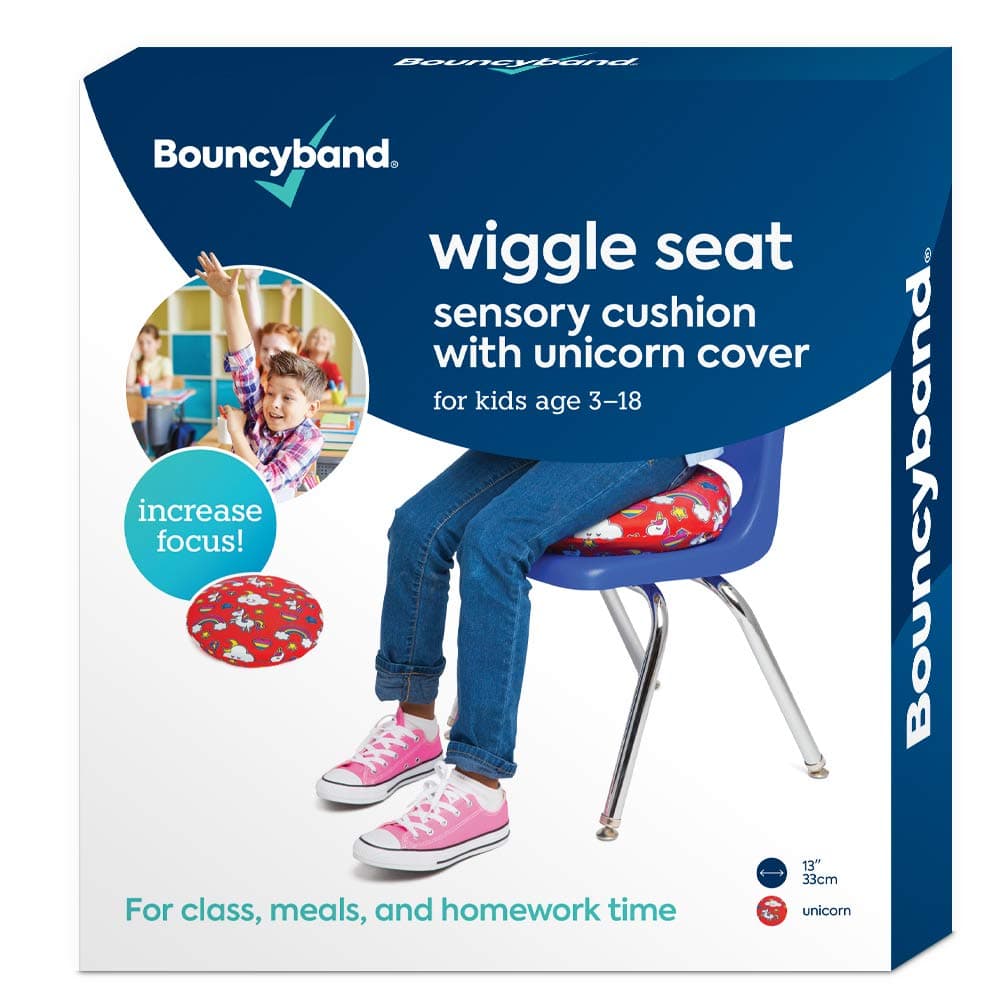 The Bouncyband Wiggle Seat Cushion is a dynamic seating solution designed to enhance focus and reduce anxiety for children. Featuring a whimsical unicorn print cover, this ergonomic cushion promotes active sitting, making it perfect for classrooms and virtual learning environments. Its unique design offers tactile stimulation, while being safe, washable, and adaptable to various surfaces.