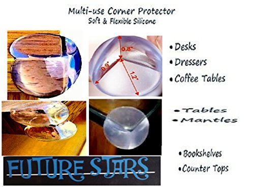 Future Stars Parent Friendly Solutions Is proud to bring you these table corner gaurds a necessity for anyone with kids, from new crawlers to running 8 year olds. Child proofing at its best. Future Stars corner cushions come in a set of 8, pre taped factory applied adhesive for easy use. Our packaging, a sealed pouch so it is recyclable and eco-friendly. Instructions for installation inside of the package making installation very easy for all. Simple to install > Just peel and stick, it quickly and securely attaches to almost any furniture surface (SEE PICS ABOVE). The corner guards give you protection that is not only soft and durable, but also cleans up easily. Future Stars Corner Guards are for more than just childproofing. They are a great application for use in the home, office, workshop or healthcare centers, Can also be used while moving furniture to protect both your furniture and walls from damage. damage. Benefits: > Semi-soft and flexible > Lightweight > Easy to install > Do not contain heavy metals > Clear color so that they are not an eye sore > Can be easily removed and won't leave marks > Non-toxic, non-allergenic and non-flammable materials Get Yours Now Add To cart