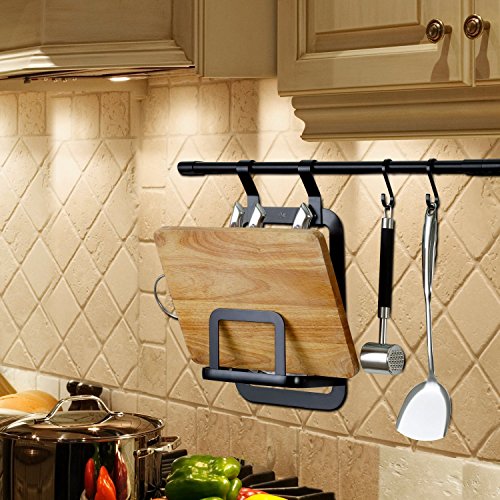 No matter how large our kitchen is, we always want more space. We enjoy cooking, but we hate to find things in the messy drawer and cupboard. The pots and pans take up too much space.With this kit, you can store your favorite kitchen utensils and vessels, saving you a lot of precious cupboard space and creating a cleaner kitchen environment. The aluminum alloy material and special design make it convenient to install. It can hold up to 40 pound, getting you out of the mess and bringing you more cooking enjoyment.The kit includes a tool holder, a spice rack, a pot cover rack, a tableware cylinder and four S-shaped hooks for hanging cookware. You may also select accessories to design a new kit in accordance with your needs, creating a more comfortable environment and beautifying your life space. The hook is 0.04 inches in thickness; it is formed by integrated molding, fits well with the rod and will not slip off. The rod has a diameter of 19mm and can hold up to 40 pound. The outer edge of the spice rack adopts the integrated casting design and the jointless radian guarantees smoothness and security.The tableware cylinder ventilates at each surface, accelerating the air drying speed and preventing bacterial growth. The pot cover rack can hold up to three pot covers, and each cover has a diameter between 8-16 inches.