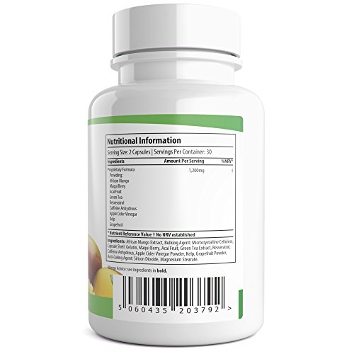 Wild Essentials African Mango Proprietary Formula contains: ✔ African Mango Extract, Microcystalline Cellulose, Gelatin, Maqui Berry, Acai Fruit, Green Tea Extract, Resveratrol, Caffeine Anhydrous, Apple Cider Vinegar Powder, Kelp, Grapefruit Powder, Silicon Dioxide, Magnesium Stearate✔ African Mango Extract - made from extracts of the seeds of the fleshy West African fruit Irvingia Gabonensis, helps reduce body fat, weight, and even cholesterol and leptin levels in overweight subjects, according to a recent study published in the journal Lipids in Health and Disease ✔ Green Tea and Caffeine - Increases fat burning, supports metabolism, and improves memory and concentration ✔ Apple Cider Vinegar, Kelp and Grapefruit Extracts - Regulates metabolism, improves concentration and strengthens your immune system Why Wild Essentials? ✔ Our 100% safe and natural capsules feature scientifically-backed ingredients - no side effects, no jitters, no cravings, no crashes ✔ Our Amazon store has 100% positive feedback for 3,000+ ratings - a trusted company with effective products ✔ Manufactured in the UK - our products will always be newer and fresher than other brands ✔ Certified GMP facility and factory-sealed bottles - for guaranteed quality ✔ Friendly and genuine customer service - you will always be listened to ✔ 30-day returns policy - get results or 100% money back