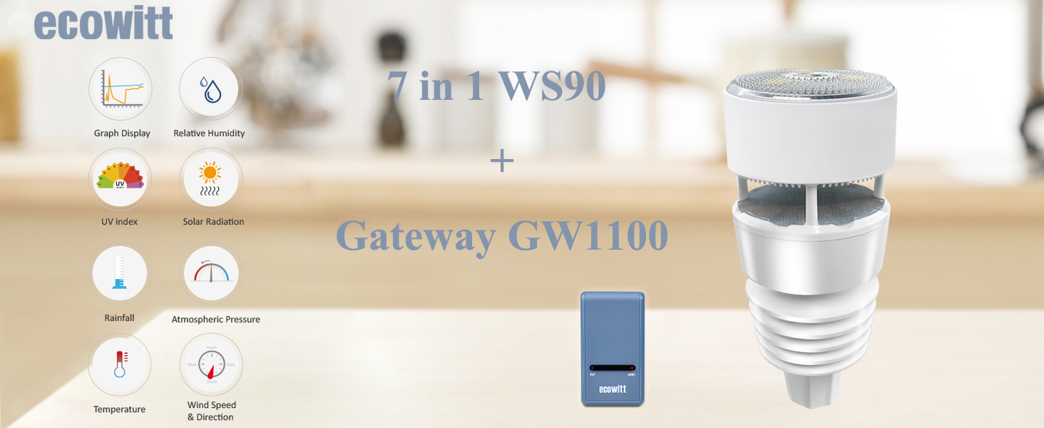 The ECOWITT WS90 Weather Station with GW1100 Gateway is a professional-grade, solar-powered 7-in-1 outdoor sensor system paired with a 3-in-1 indoor WiFi gateway. It offers precise monitoring of temperature, humidity, wind speed/direction, rainfall, UV light, and atmospheric pressure. Featuring 868MHz wireless connectivity and seamless cloud integration, it empowers smart home and garden management with expandable sensor support and easy installation.