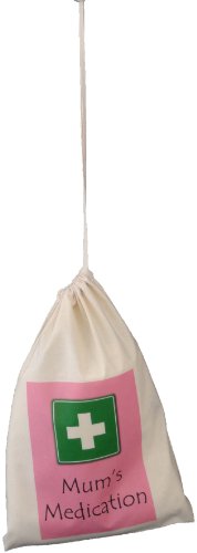 A small natural cotton drawstring bag printed on the front with a green First Aid design and the wording 'Mum's Medication'. The bag measures approx 25cm x 35cm and is ideal for storing tablets, syringes etc for travelling.
