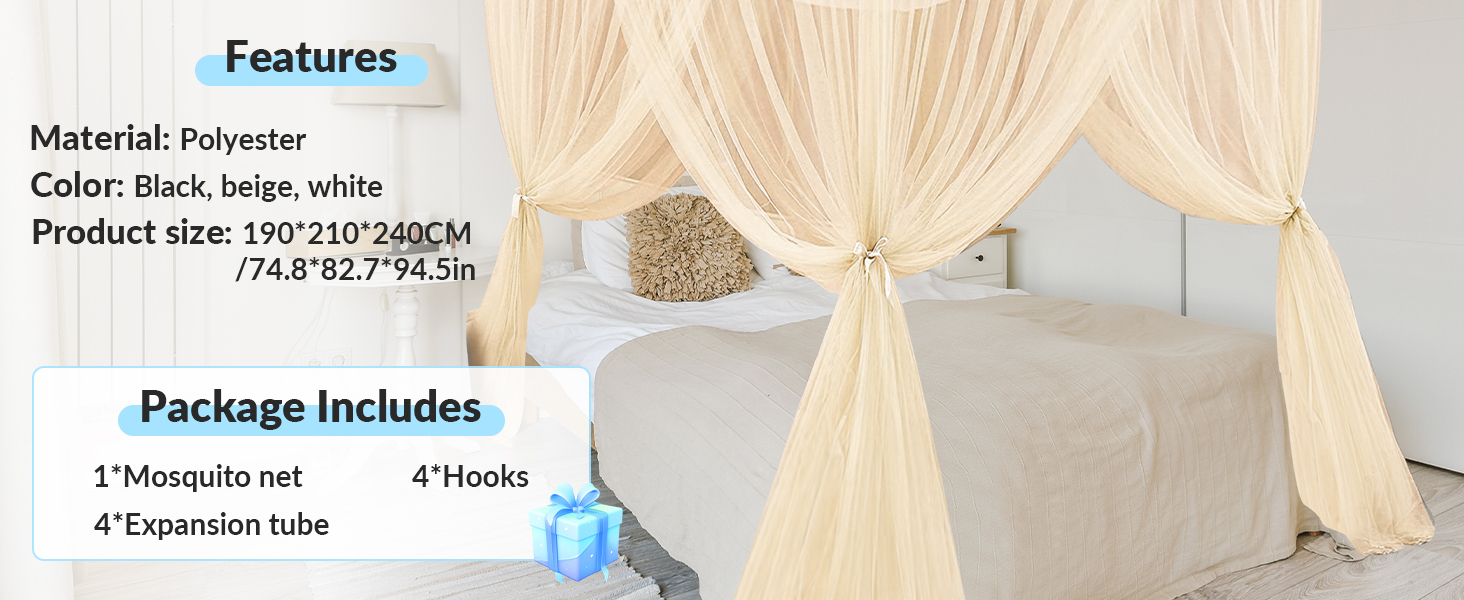 The HomeChi Mosquito Net is a large, square canopy designed to fit beds from twin to king size (71-79 inches wide). Made from high-quality, breathable polyester mesh, it offers durable, washable protection against mosquitoes and insects. Featuring four convenient openings and hanging loops, it’s easy to install from the ceiling and provides maximum ventilation and access. Its sleek design adds a decorative, elegant touch to any bedroom or outdoor space, ensuring a peaceful, insect-free sleeping environment.