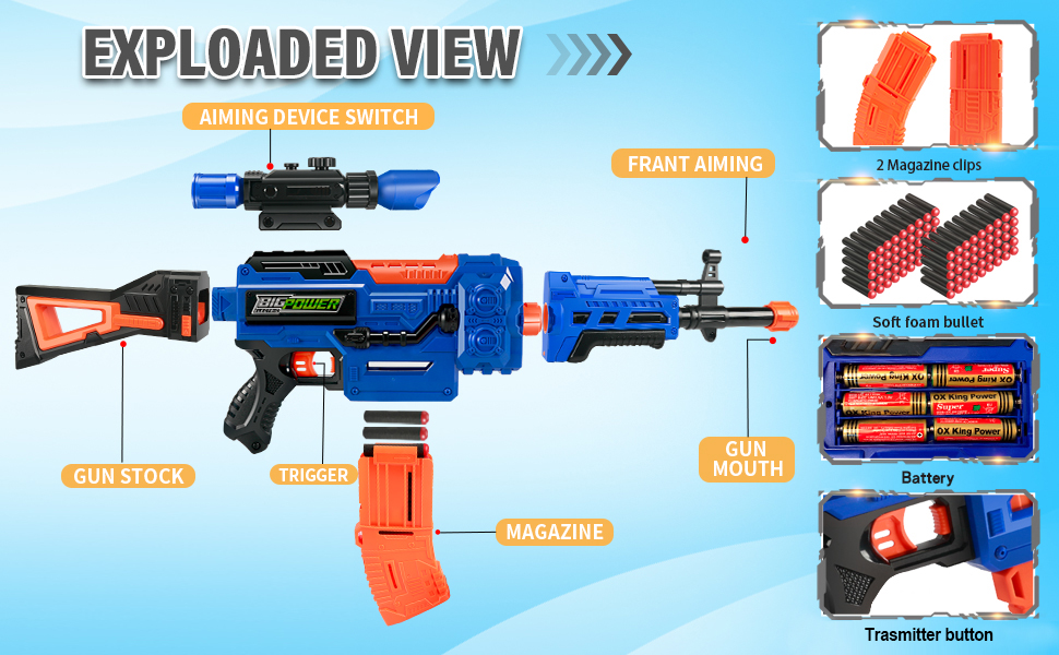 The Bigpower Electric Kids Toy Sniper Rifle is a 4-in-1 modular, battery-powered dart gun designed for kids aged 8-12. Featuring a 50ft shooting range, removable magazines, and a full tactical vest kit, it offers a safe, customizable, and immersive outdoor play experience. Powered by 6 AA batteries, it eliminates recharge wait times, making it perfect for extended play sessions and group battles.