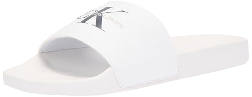 The Calvin Klein Slide Monogram mens slides blend sustainable production with a durable IP54 rating, offering a stylish and practical sandal in classic Bright White and Black. Perfect for the modern professional seeking comfort, quality, and eco-conscious fashion.