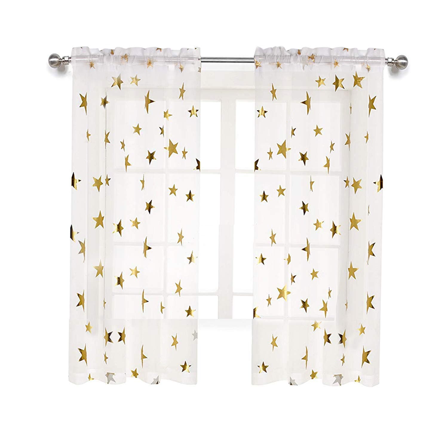 Anjee White Sheer Curtains feature two 52"x63" semi-sheer voile panels adorned with a stunning gold star foil print. Crafted from 100% polyester, these lightweight drapes balance natural light flow and privacy, fitting standard rods with a 1.5" pocket. Easy to maintain with machine washability, they come backed by a 12-month warranty and 30-day return policy, perfect for modern bedrooms, nurseries, or living rooms seeking a chic, celestial touch.