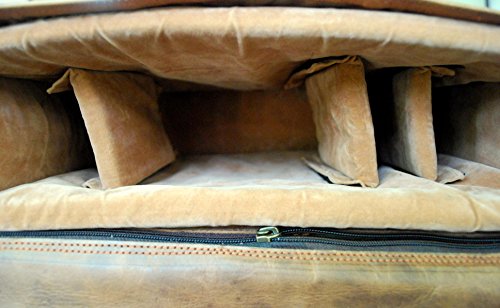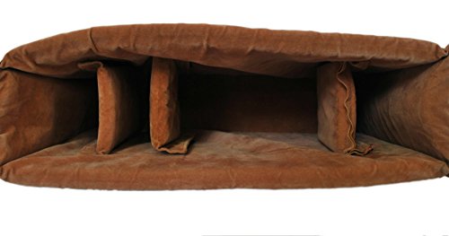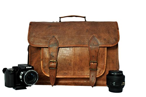 Genuine Leather Handcrafted by Indian artisans. Eco Friendly Bag Naturally Tanned Made of Full grain genuine Goat Leather tanned using natural ingredients. Use of fabric lining on the inside for enhanced durability and sturdiness. 4 detachable internal compartments for carrying camera body, lenses, batteries etc one additional compartment on the inside wall of the bag to carry ipad, etc 1 zippered pockets - on the internal wall of the bag One big pocket on front side of the bag and 2 additional small pockets on each side. Bag's external dimensions (Inches): 12(H) x 16(W) x 6(D) Color: Brown
