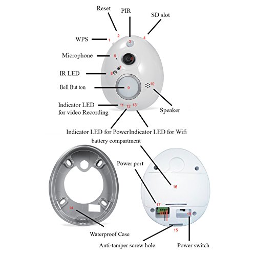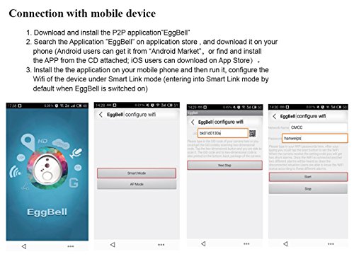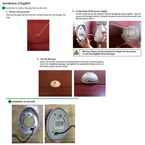Product Features: 1. Wifi Visual intercom doorbell is a doorbell work with wifi; 2. It connect with home wifi or wired LAN achieve two-way intercom between doorbell and cell phone; 3. When visitors press the doorbell ,doorbell sounds and meanwhile camera will start to work sending real-time picture and call to smart phone; 4. User receive the call and see the video to check who is outside ,can intercom with visitors and remotely unlock door etc; 5. Wifi Visual intercom doorbell have alarm and remote control functions , make your home security has more powerful barrier. Specification: * Battery Type:18650(Not Include)* Protocol: HTTP、TCP/IP、UDP、SMTP、DDNS、DNS、SNTP、DHCP、FTP、RTP、RTSP、UPNP、ONVIF、28181 * Wireless Standard: IEEE 802.11b/g/n * App By Phone & Tablet: Android and iOS System * Power Supply: DC 5V/2A * Picture Resolution: 1. Main Flow: 1280*720@20fps 2. Minor Flow: 640*360@30fps Environmental: * Operate Temper: -10°~60°C * Operating Humidity: -10%~85% * Certification: CE, FCC Package included: - 1 x Unique Egg Wifi Vedio Doorbell - 1 x CD with software - 1 x Power adapter - 1 x Instruction Manual - 1 x Instruction Package - 1 x Bracket Note: *Product is not waterproof *This egg doorbell can either be operated with 2 x 18650 batteries (not included) or the included a/c adapter. *Any problems please contact us,we will solve your problem try our best.