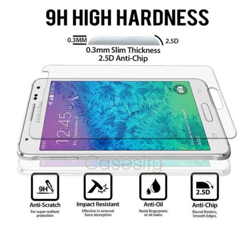 Protect your cell phone with this premium real Temper Glass flim screen protector. Transparent glass that has been reinforced to increase shock absorbency. While it is .26mm thick, it still provides a high level of surface hardness without losing in touch sensitivity.Surface Hardness - .26mm thick and made with chemically treated, transparent tempered glass. 8-9H: even sharp objects such as knives and keys will not scratch the tempered glass.Anti-Shatter Film - If tempered glass breaks, the tempered glass breaks into small pieces that are not sharp, making it safe for users.Oleophobic Coating - The tempered glass has an Oleophobic coating that prevents fingerprints & other contaminants which also make the film easy to clean.Delicate Touch: Flim is coated on the back with a strong silicone adhesive that makes installation easy and attaches the film firmly so it would not affect the screen's sensitivity.MADE FOR: Samsung Galaxy Alpha G850MATERIAL: TEMPERED GLASS FILMPACKAGE INCLUDES: 0.26mm Temper Glass Film Screen ProtectorMicrofiber Cleaning ClothAlcohol Wipe for installation preparation.**Please Note** All products will be sold and shipped in original Casesity Retail packaging.