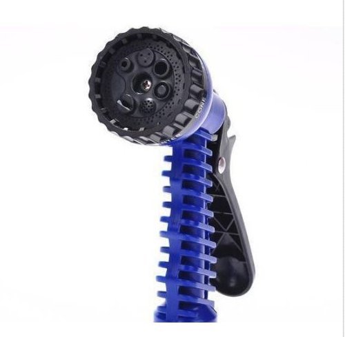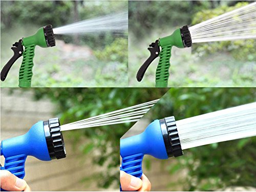 Features: Made with durable and pressure-resistant latex material, these hoses are safe for average water pressure and wont burst, leak, or break. When not in use, the pipe shrinks down for easy storage and is super easy to coil without kinking or twisting. The 7 functions are: Flat, Cone, Full, Jet, Shower, Mist, and Center. Drain the water in seconds by contracting back automatically. Super strong latex core. Specifications: Product dimensions: Original length: 33 feet/Expanding hose length: 100 feet Package dimensions: 7.5" x 5.1" x 8.5" Product weight: 2.1 lbs Packing Contents: 1. x1 Blue Hose 2. x1 Spray Gun(7 Multi-function) 3. x2 Adaptors
