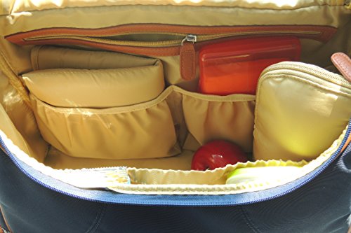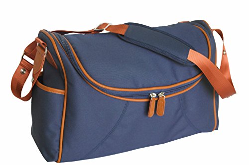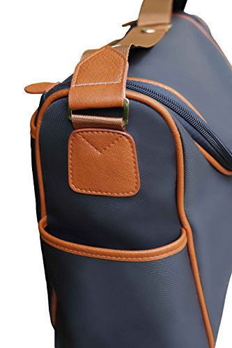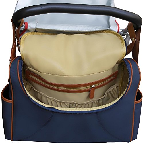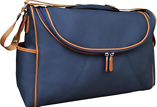 Features: - Dimensions: Length 17" X Width 6" X Height 12" - Shell material in lightweight but durable denier nylon in navy with burnt orange trimmings - Two easily accessible side open pockets - Deep back pocket with Velcro closure. - Adjustable shoulder strap with non-skid shoulder pad. -Able to hang from stroller with large snaps on shoulder strap - Rubber feet at the bottom, stand alone function - Lining in high quality nylon. - Spacious interior, two elasticated pockets and a full size framed zipper pocket on the inside back and an elasticated pocket on the inside front, keeping everything organized and neat. Accessories included: - A good size padded changing pad - A drawstring sac for wet clothes -An insulated bottle holder which is large enough for big bottles