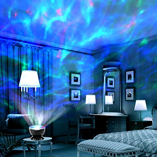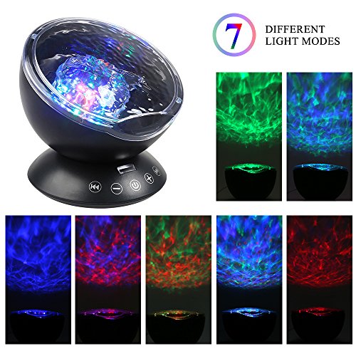Latest Upgraded Ocean Wave Projector Night Light, which can project colorful lights on the smooth ceiling or walls to create a romantic, relaxing and delightful atmosphere.It is Hypnotic Music Lamp, Atmospheric Projector, Card Readable & Sound All-in-One Device.Product Features:• 7 color changing Modes, give you a more clear sea world with the 12 super bright LED beads• With Remote controller and touch senor keys, dual-optional and more convenient for operation• The led inside the projector can also be rotating automatically, which can be controlled by the remote control• The lamp can also be tilted 45 degree, convenient for you to project the light straight up or point in an appointed direction• Built-in 4 lullaby music: forest insect sounds, ocean wave sea gulls sounds, flowing water birds sounds and merry nature sounds• TF Card Readable: plays your favorite song while light show, and the audio input can be connected to MP3, phone and PC for music playing• Auto Off Timer: there are 1hr, 2hrs, 4hrs for your choose. You can access these settings and options without getting out of your bed• Perfectly fit for any holiday party decorations to create an enjoyable and relaxing bedtime experience for children and adultsProduct Specification:• Size: 13 x 13 x 11cm• Net Weight: 10.3 oz• Power: 160Hz-20KHz• USB Cable Length: 1.2M• Audio Cable Length: 0.6M• Rated Volt/Current: DC 5V/1A• Motor Specification:5V/13 Circle• Material: ABS/PS/Metal/Electronic Components100% MONEY BACK GUARANTEEPackage includes:• 1 * Neolight Ocean Wave Night Light• 1 * Remote Controller• 1 * Micro USB Cable• 1 *3.5mm Audio Cable• 1 * User Manual• We're so confident that you'll love this headtorch, that if you are not, whatever the reason, we will replace it or give you back every penny.