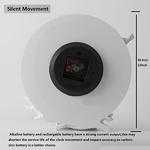 Specifications Style: Modern Color: White Material:Metall/Paper/ABS/Glass Weight:1.5kg/3.3lb Product Dimensions: 30.5*30.5 cm/12*12 inch Power: 1 X AA batteries (not included) Display Type: Pointer Appearance: Round Packing list: 1 X Wall Clock Attention: * The clock is unframed, and there is no glass face as the cover. * There are slight difference between the picture and the real item caused by light brightness. * Alkaline battery and rechargable battery have a strong current output,this may shorten the service life of the clock movement and impact accuracy,so carbon-zinc battery is a better choice. Customer Service 1. If you have any questions or requests,just email us, we will solve for you in 12 to 24 hours. 3. Before leaving a negtive feedback, please contact us first,we will try to work out a satisfactory solution for you.