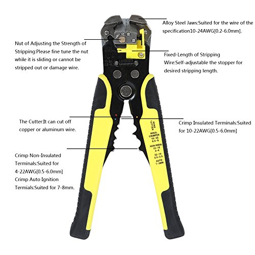 ValueHall Wire Stripper Plier, Self-Adjusting Automatic Wire Stripper Multifunctional Cable Stripping Cutting Peeling Pliers Tool AWG 24-10(0.2~6.0mm²) V7008-1 Description: Why choose our Wire Stripping Tool? Our product is 100% new and made of high quality steel with a long lifetime. It's an automatic, adjustable, multifunctional tool which is easier to control with the non slip handle. It's adjustment screw can adjust the strength of stripping. Tips: Please keep your fingers away from the centre section when stripping in avoidance of hurting your hands. Please put it out of the reach of children after using in avoidance of hurting them. Specification: Materials: Stainless steel Size: L: 20.5cm/8.07in; W: 11cm/4.33in Color: Yellow Weight: 350g Operating Functions: For insulated terminals 10-22AW (0.5-6.00mm) For non-insulated terminals 4-22AWG (0.5-6.00mm) For auto ignition terminals 7-8mm Package includes: 1x Wire Stripe Kindly Note: Size: Due to the measurement of different people, there should be 1-3 cm difference when different people measure it. Color: Due to different camera, light environment and display, the physical color will be a little different from pictures.