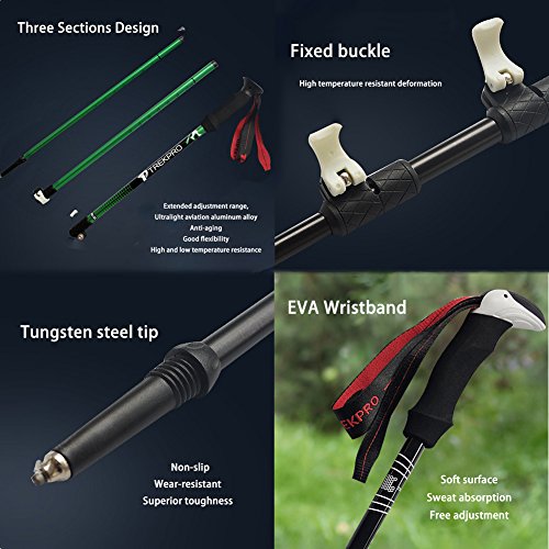 Specifications:Color;black pink purple blueMaterial: 7075 aluminum alloyWeight: 280gSize: the shortest size: 65CM, after adjusting the longest size: 135CMProduct Features;Longer adjustment range, using ultra-light aviation aluminum alloy material, light weight, anti-aging, toughness and corrosion performance, high temperature resistance, good flexibility. Safer and more comfortable.Comfortable rubber material, good grip, sweat absorption, non-slip shock absorption, humanized groove design increases the friction of the hand.The surface is triple treated, polished and oxidized, with vivid colorsPutting snow trays on the dirt road can prevent sags. When you go on flat roads, you can wear non-slip shoes.Trekking poles can reduce knee pressure, improve stability when climbing, and protect your waist and spine. It is the best companion for outdoor sports.Attention;Non-slip feet is for flat roads ,mud/snow tray is suitable for mud,snow and mountainous terrain to prevent plunging into soft mud and crevices .When the trekking poles fall into the stone seam, pull them vertically.Packing includes:trekking poles *2snow mud tray *2Non-slip feet *2