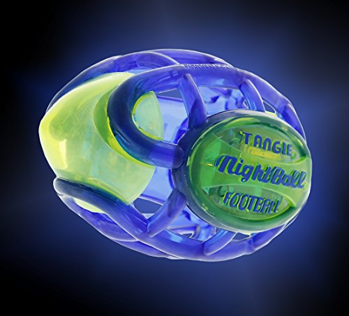 The Tangle NightBall Football is loads of fun when played during night time - each football contains special LED lights that illuminate when the ball is thrown. Measuring 8 x 4.5 x 4.5 . The faster the ball spirals through the air, the brighter the LED lights glow. One battery is included. LED Lights can last up to 40-50 continuous hours of play.