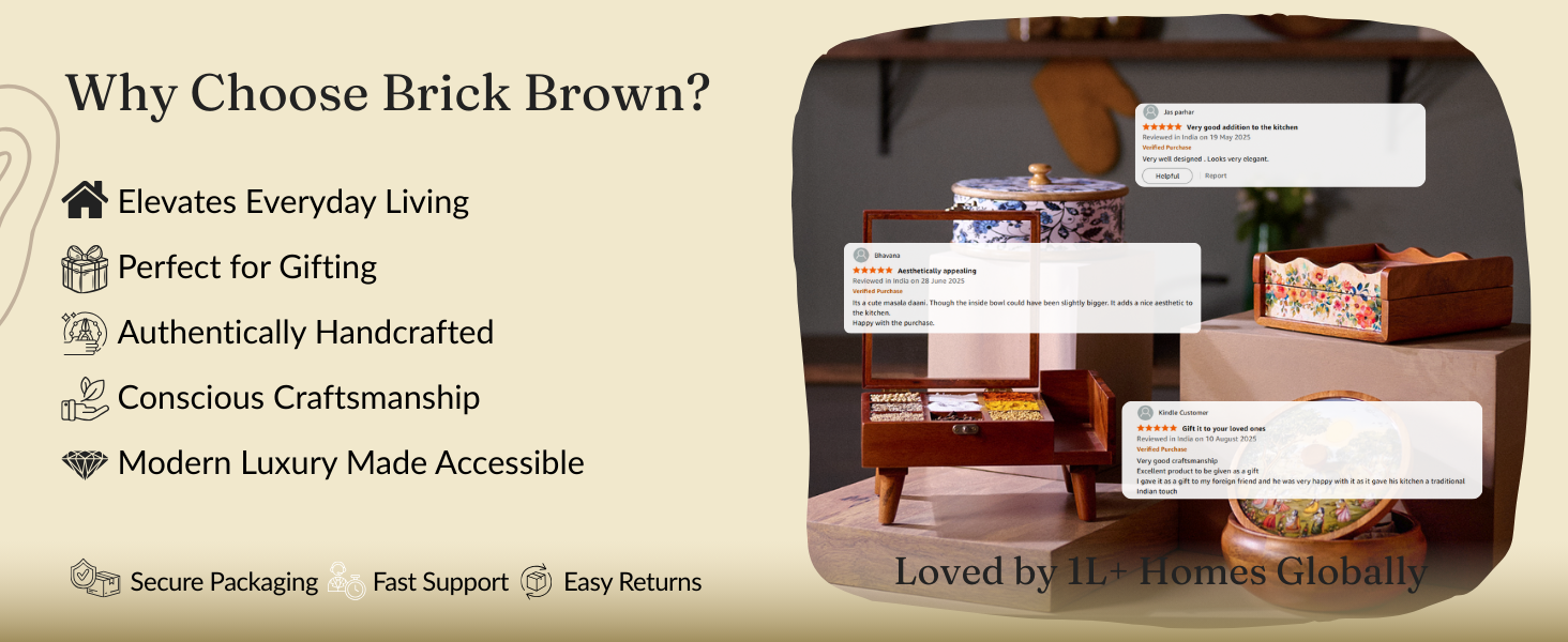 The Brick Brown® Wooden Enamel Coated Saga Masala Box is a compact, handcrafted spice organizer featuring a solid mango wood base, a vibrant Phad painting lid, and seven removable stainless steel containers. Designed for durability and style, it offers a premium food-safe finish and easy maintenance, making it the perfect blend of traditional artistry and modern kitchen functionality.